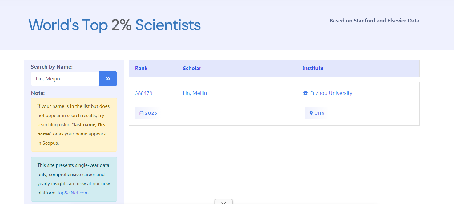 9月19日,由美国斯坦福大学(Stanford University)和国际权威学术出版社爱思唯尔(Elsevier)共同发布最新第八版的2025年全球前2%顶尖科学家榜单(World’s Top 2% Scientists)。课题组长,福州大学材料与工程学院副院长林梅金研究员有幸入选全球前2%顶尖科学家年度科学影响力榜单,祝贺!