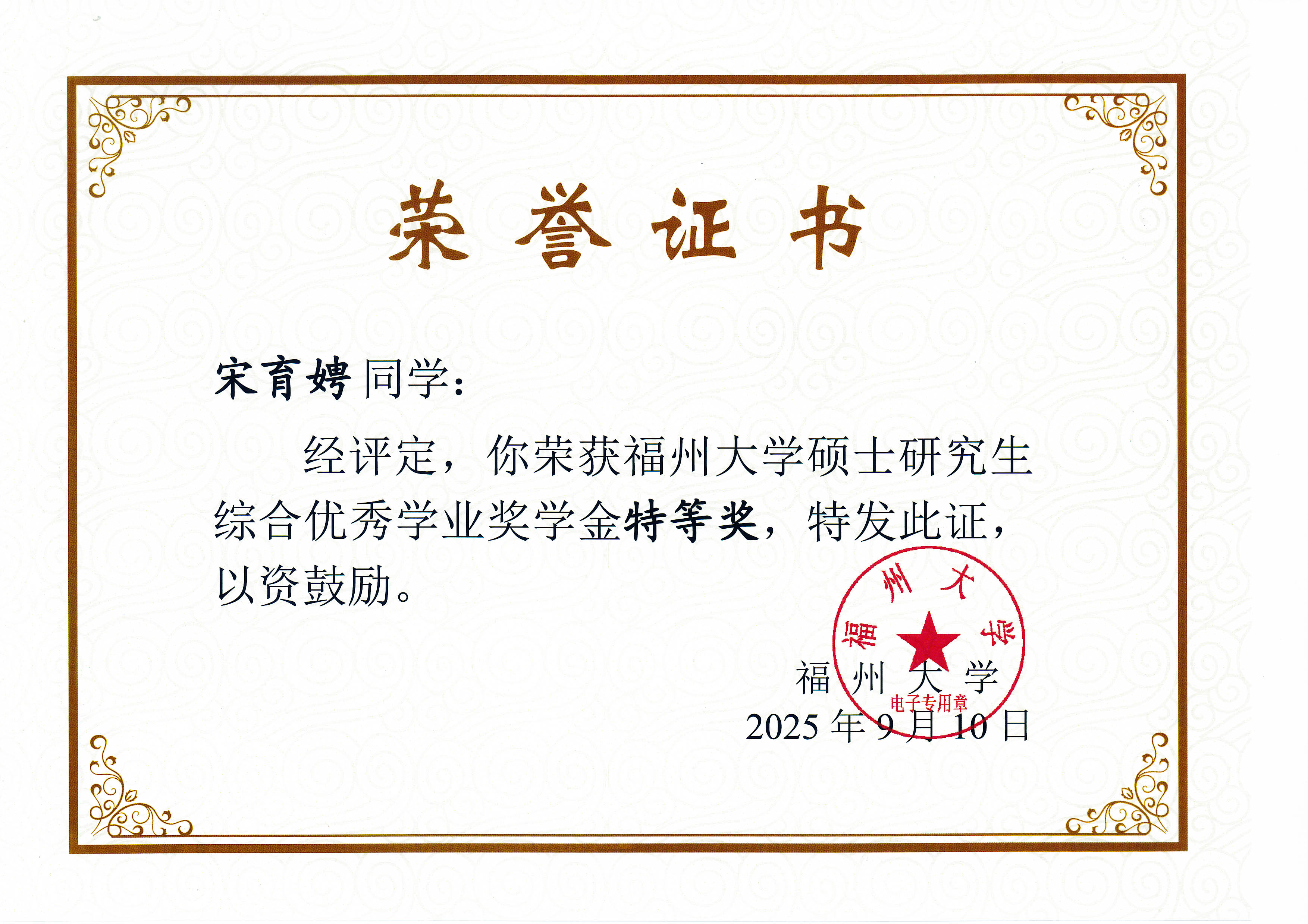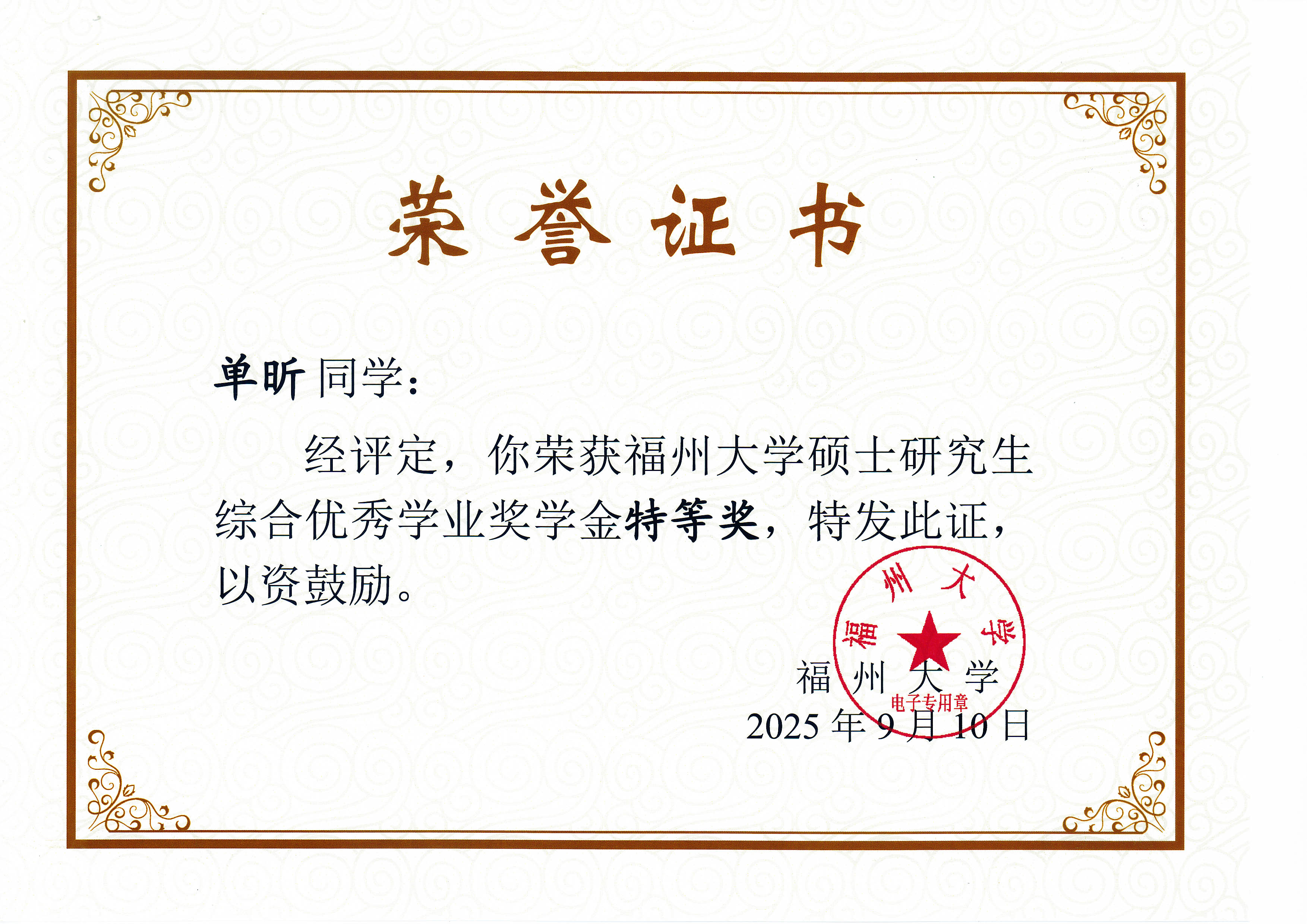 课题组硕士毕业生吴良、单昕、宋育娉和杨希等四位同学荣获福州大学硕士研究生综合优秀学业奖学金,其中吴良、单昕和宋育娉荣获特等奖,杨希荣获二等奖,特此祝贺!